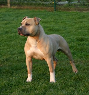 Américain Staffordshire Terrier doit être compact, ni haut sur pattes, ni levretté dans ses lignes. Sa queue est portée à l'horizontale.. |